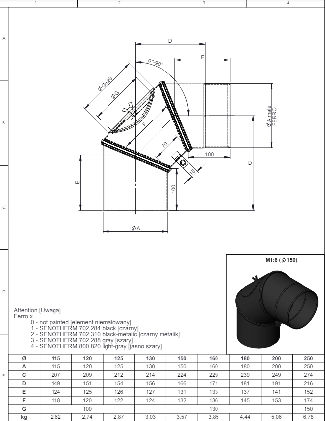 Kolano stalowe regulowane 0-90° fi130 z rewizją czarne gr. 2mm przyłączeniowe