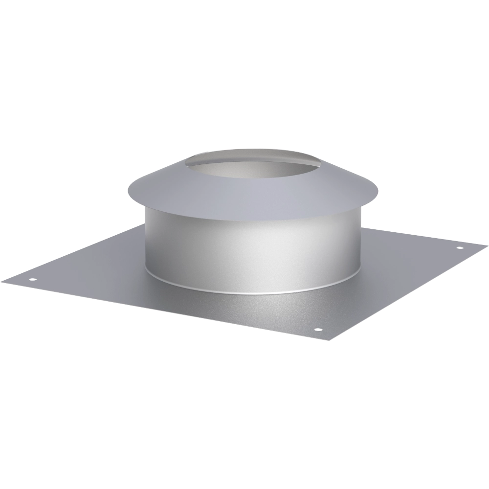 Wymiar płyty, to 450x450 mm. Kołnierz przeciwdeszczowy zakrywa szparę dylatacyjną między rurą wkładu kominowego, a płytą kominową. Zapobiega to cieknięciu deszczówki po zewnętrznej ścianie wkładu kominowego. Na rogach płyty znajdują się otwory montażowe. Sama płyta posiada wypust w górę dla lepszej ochrony przed deszczem. W płycie kominowej znajdują się również 4 wąsy, które stabilizują rurę wkładu kominowego.