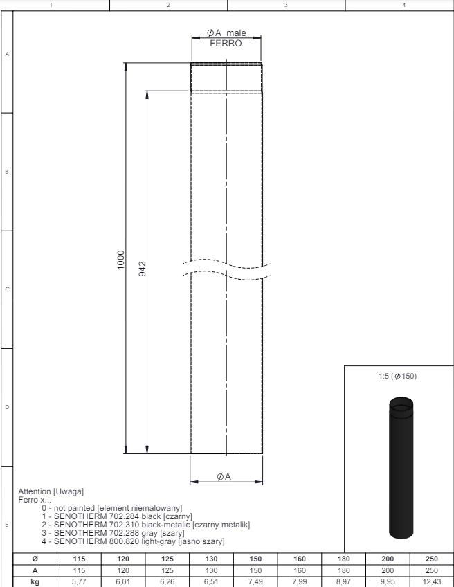 Rura 1 m stalowa fi130 czarna gr. 2mm przyłączeniowa