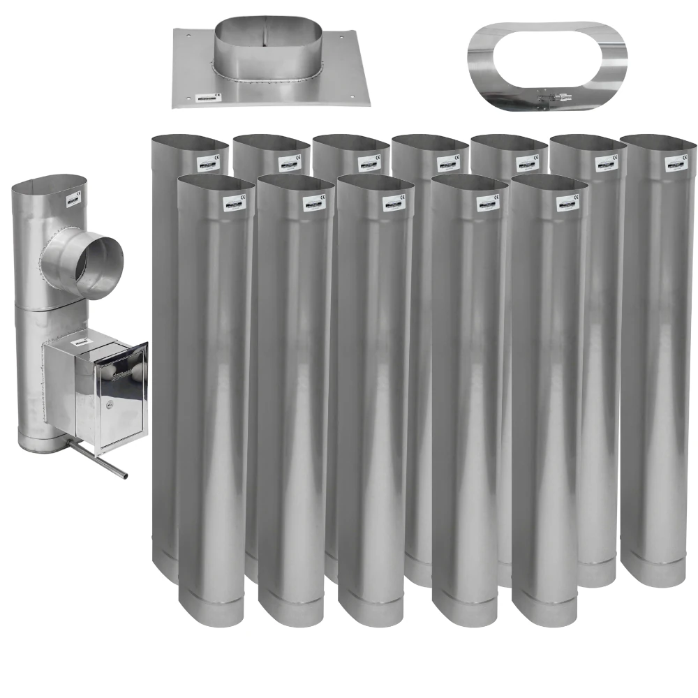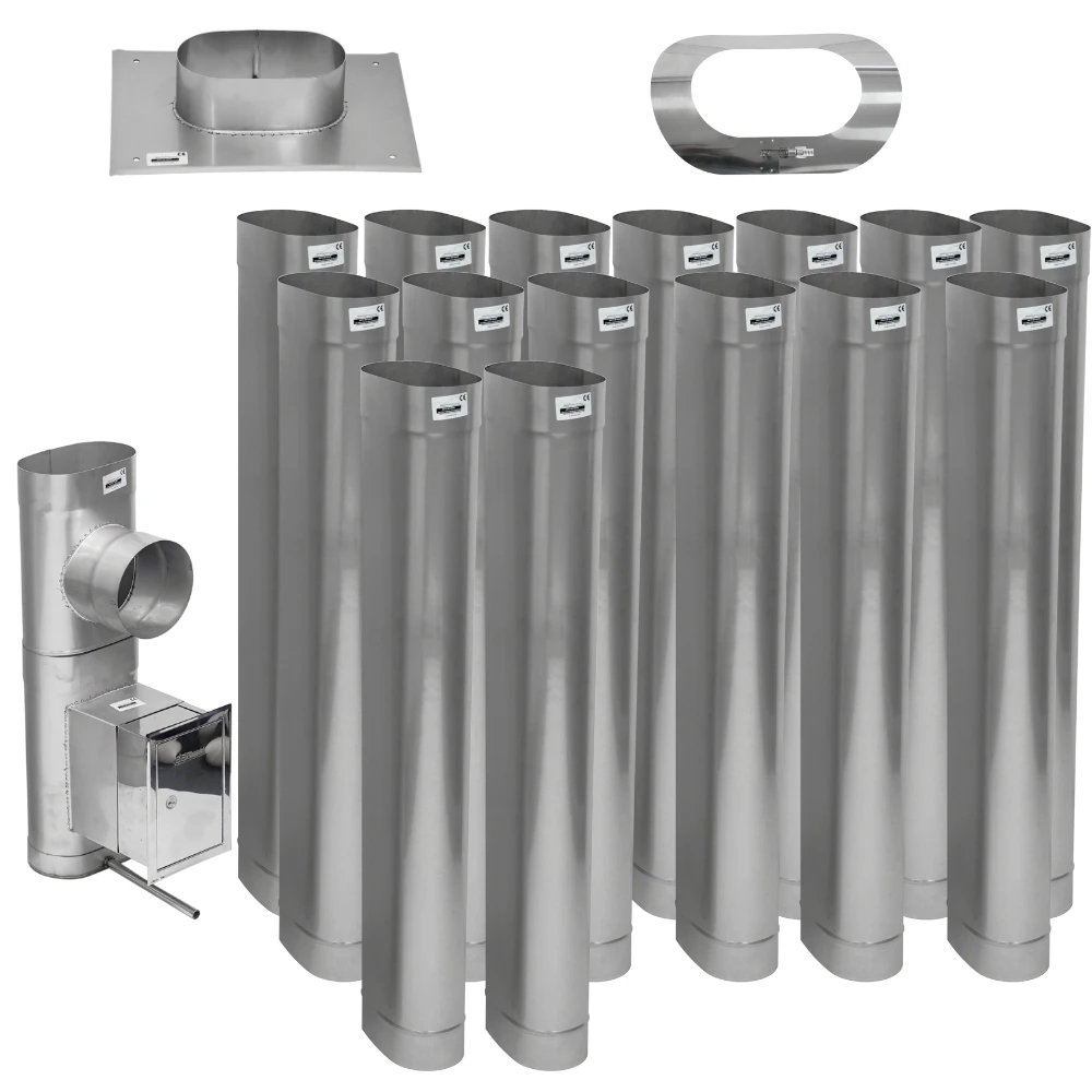 Zawartość zestawu płyta kominowa, kołnierz przeciwdeszczowy, rury kominowe, trójnik 90°, wyczystka, drzwiczki z przedłużką, odskraplacz, daszek (opcjonalnie)