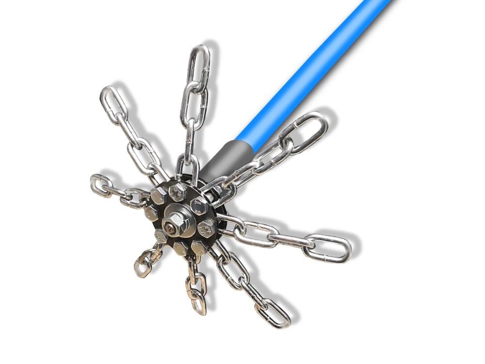 Łańcuch na głowicy ma uniwersalną długość (ok. 25 cm) i pasuje do każdego kształtu komina. Dzięki wymiennym wkładom, Turbospinerem można czyścić: